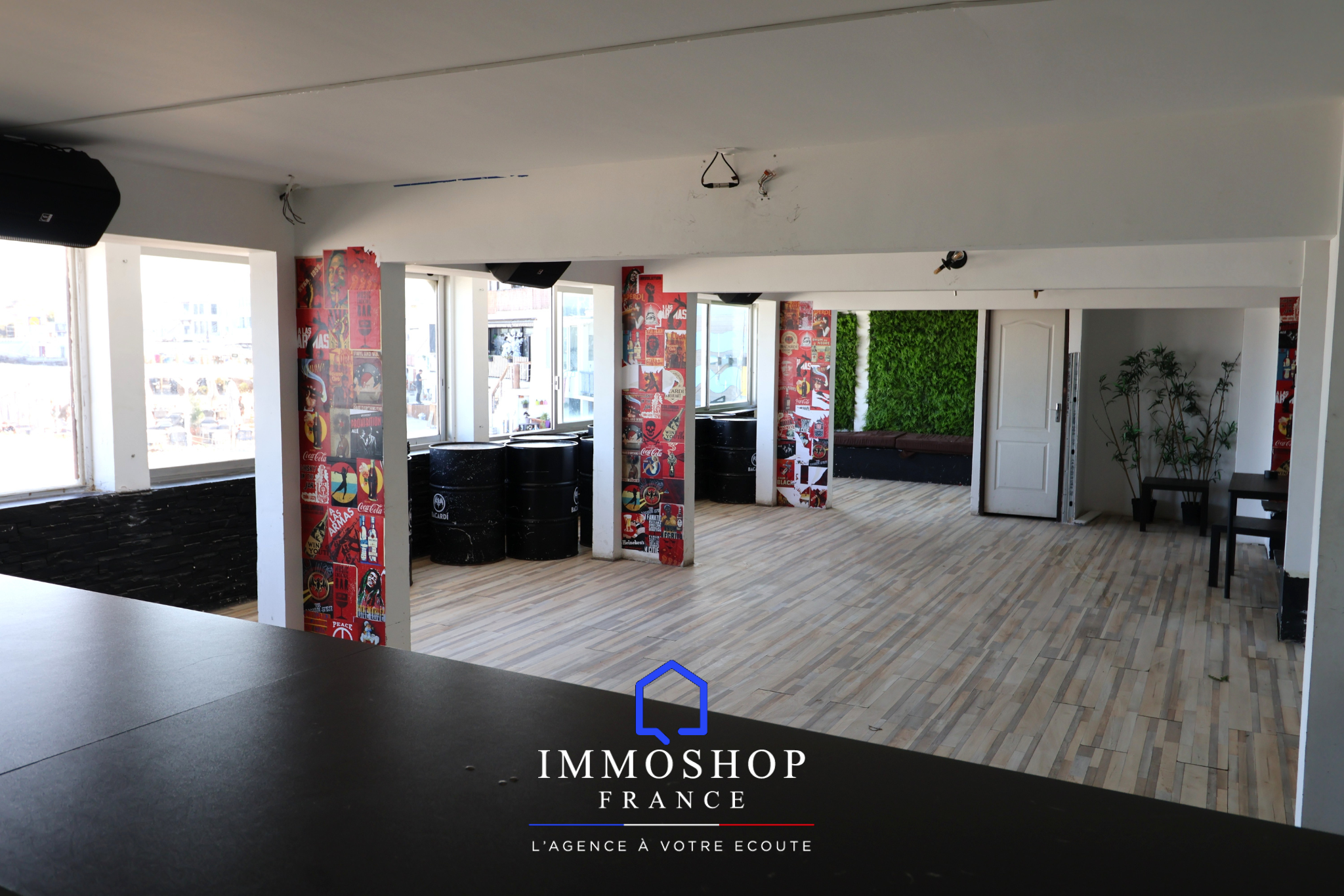 Salle à l’étage avec bar, parfaitement adaptée pour organiser des soirées, événements privés ou développer une activité complémentaire.