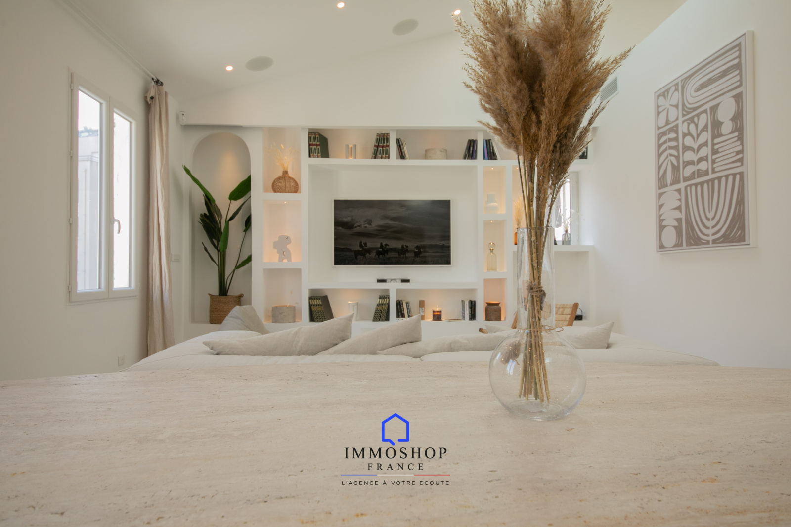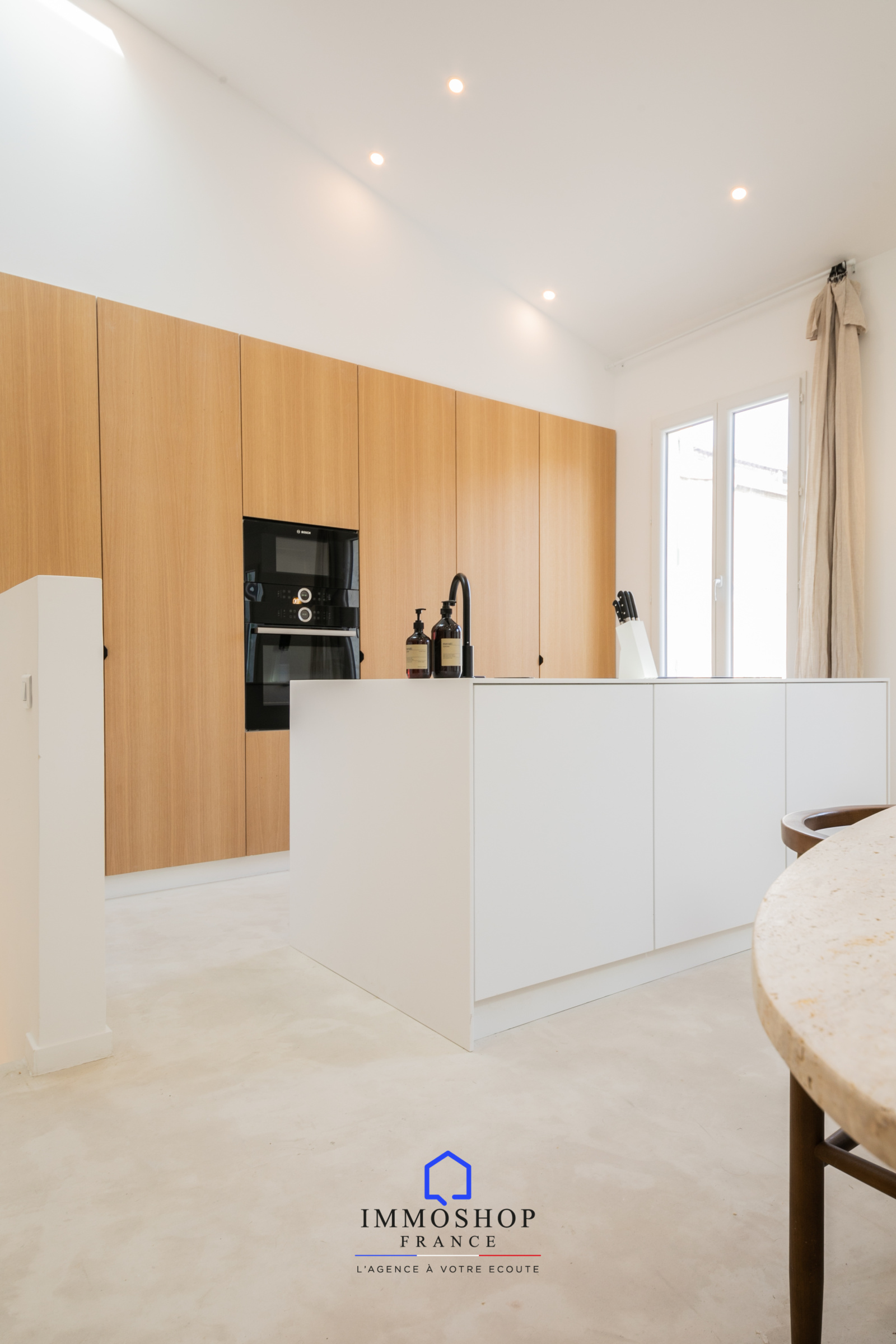 Dans un univers harmonieux, la pièce à vivre ainsi que sa cuisine équipée d'un îlot central sont surplombées par un plafond cathédrale de 4 mètres de hauteur accentuant le côté atypique de ce bien. Deux chambres avec leur propre salle d'eau ainsi qu'un WC viennent compléter ce niveau.
