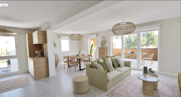 Elle se compose d'un salon lumineux de 35 m², climatisé, avec cuisine équipée de 10 m² ouverte, créant un espace de vie convivial et moderne.
