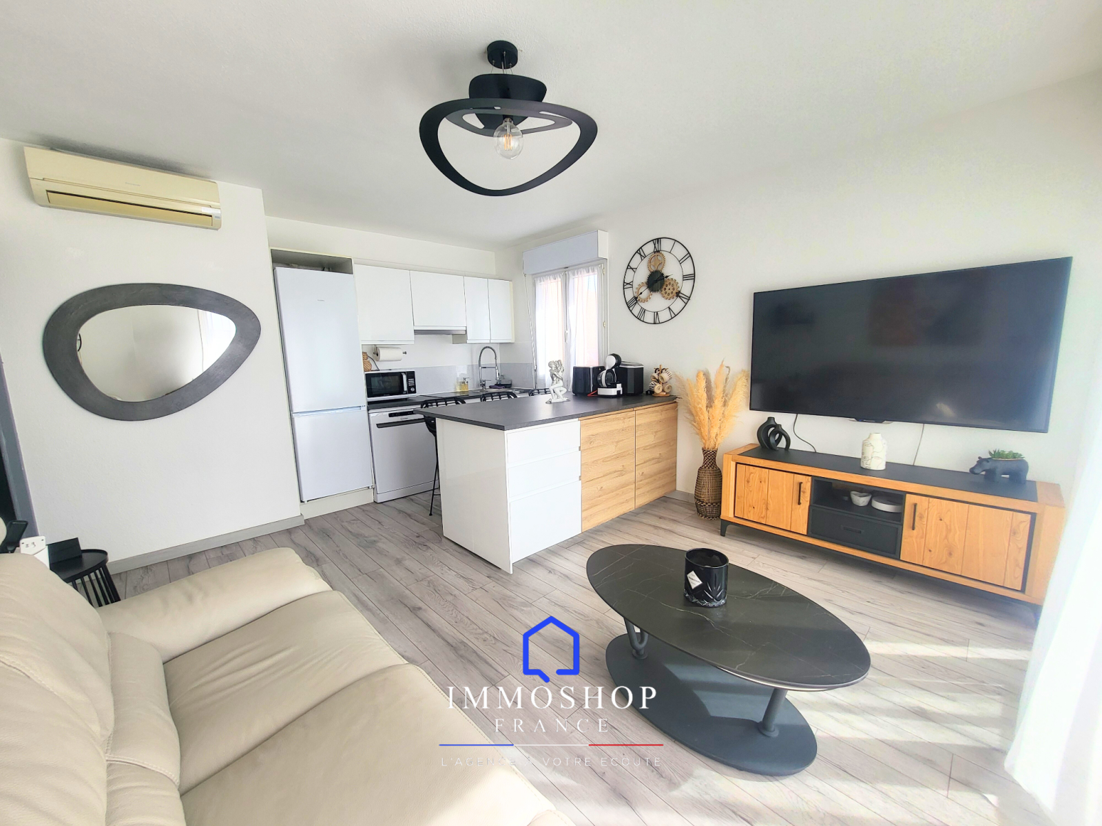 Salon lumineux avec cuisine ouverte