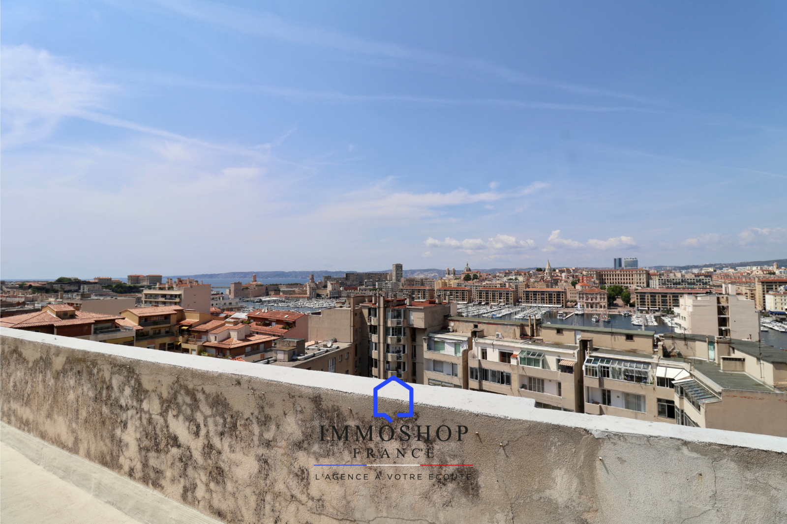 Dans un immeuble ancien avec ascenseur, vous bénéficierez de deux terrasses communes (100 m²) avec vue sur le port de Marseille et la cathédrale de Notre Dame de la Garde.