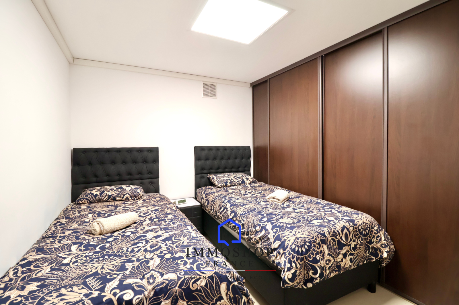 Au niveau inférieur, accessible par le garage ou par l’extérieur se trouvent 3 autres chambres avec salle d’eau, une cave à vin et un espace rangement.