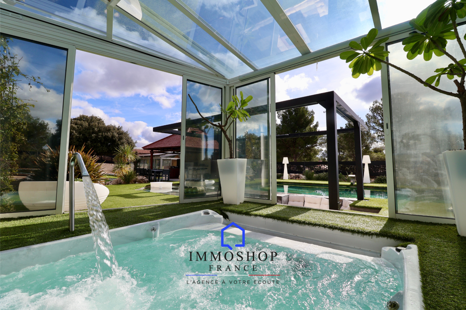 De nombreux espaces de détente sont présents sur la parcelle : une piscine traditionnelle avec cascade, un jacuzzi, un pool house au style balinais entièrement équipé et avec WC, un terrain de pétanque et une serre de jardin.