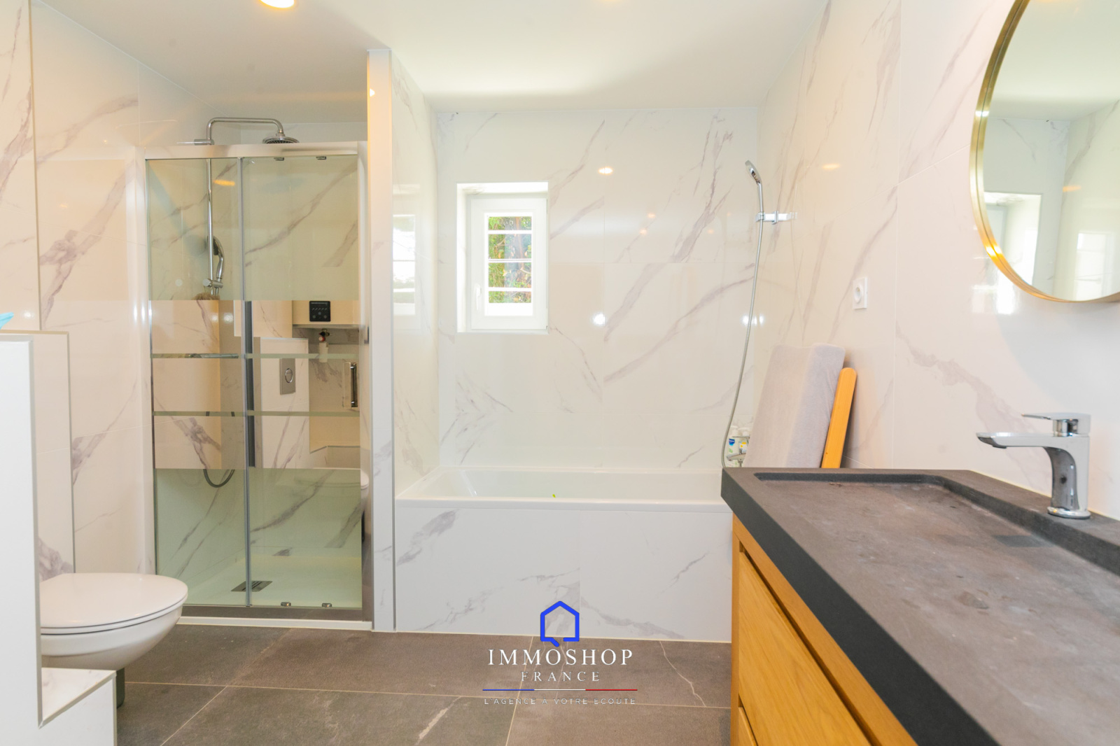 La salle de bain principale comprend: une baignoire, un bac à douche, un WC et un lavabo double vasque.Dans le couloir se trouve un deuxieme WC.