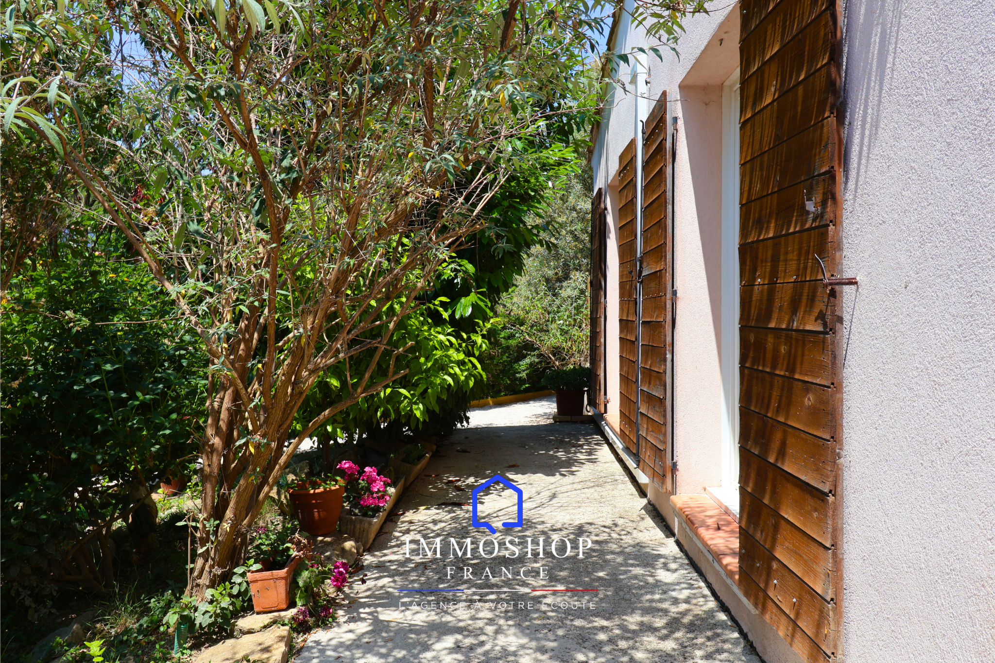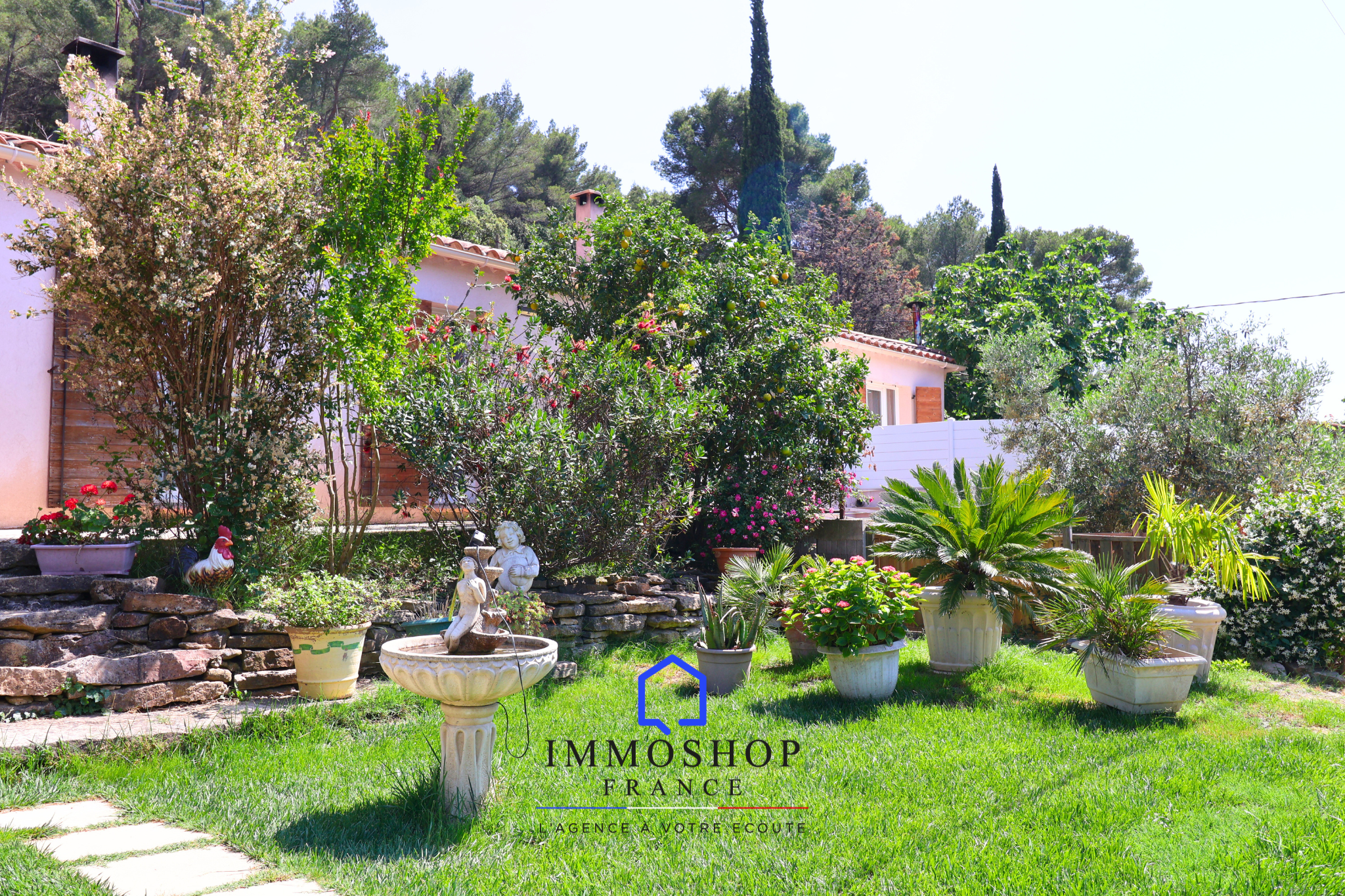 Jardin soigné avec arbres fruitiers et plantes méditerranéennes