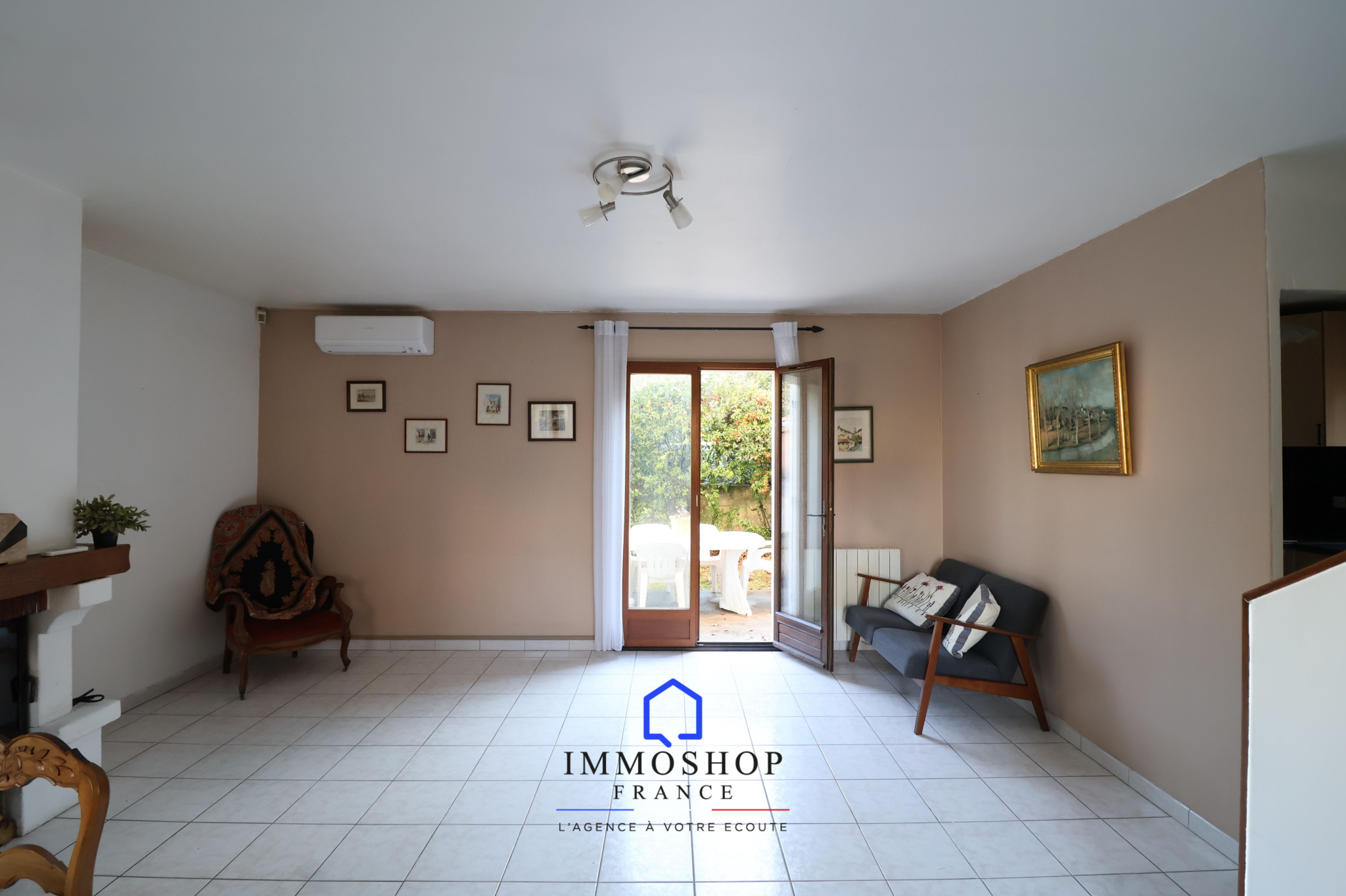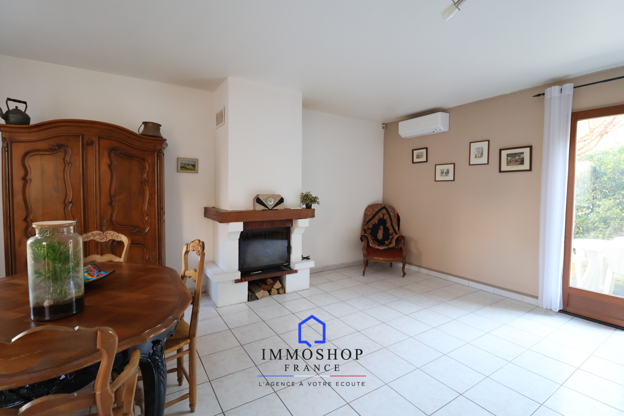 La maison propose un bel espace de vie avec un salon lumineux de 28 m², équipé d’une climatisation réversible et d’une cheminée fonctionnelle,