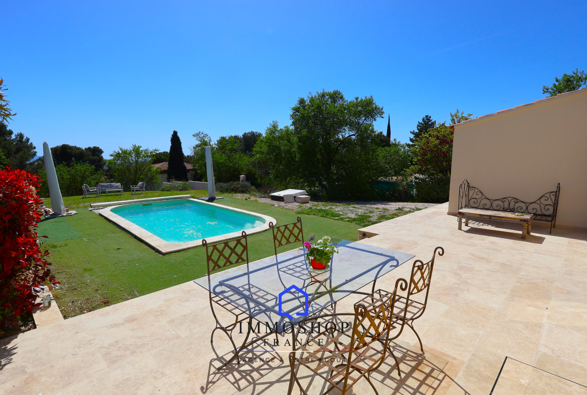 Côté jardin : Une grande terrasse carrelée prolonge le séjour vers un vaste jardin arboré avec piscine.