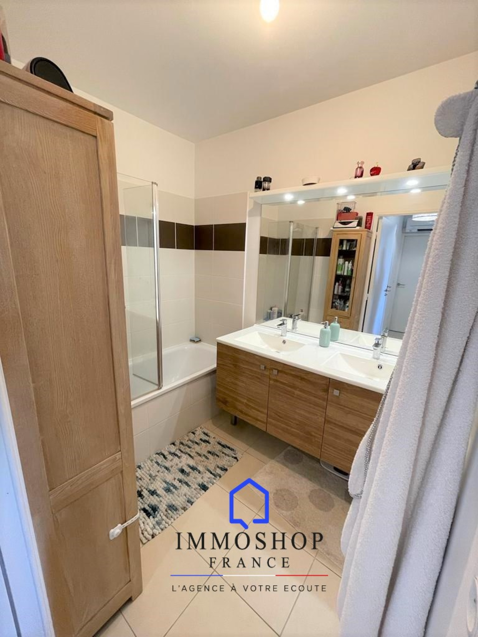 Une salle de bain comprenant, une baignoire ainsi qu'un lavabo double vasque.